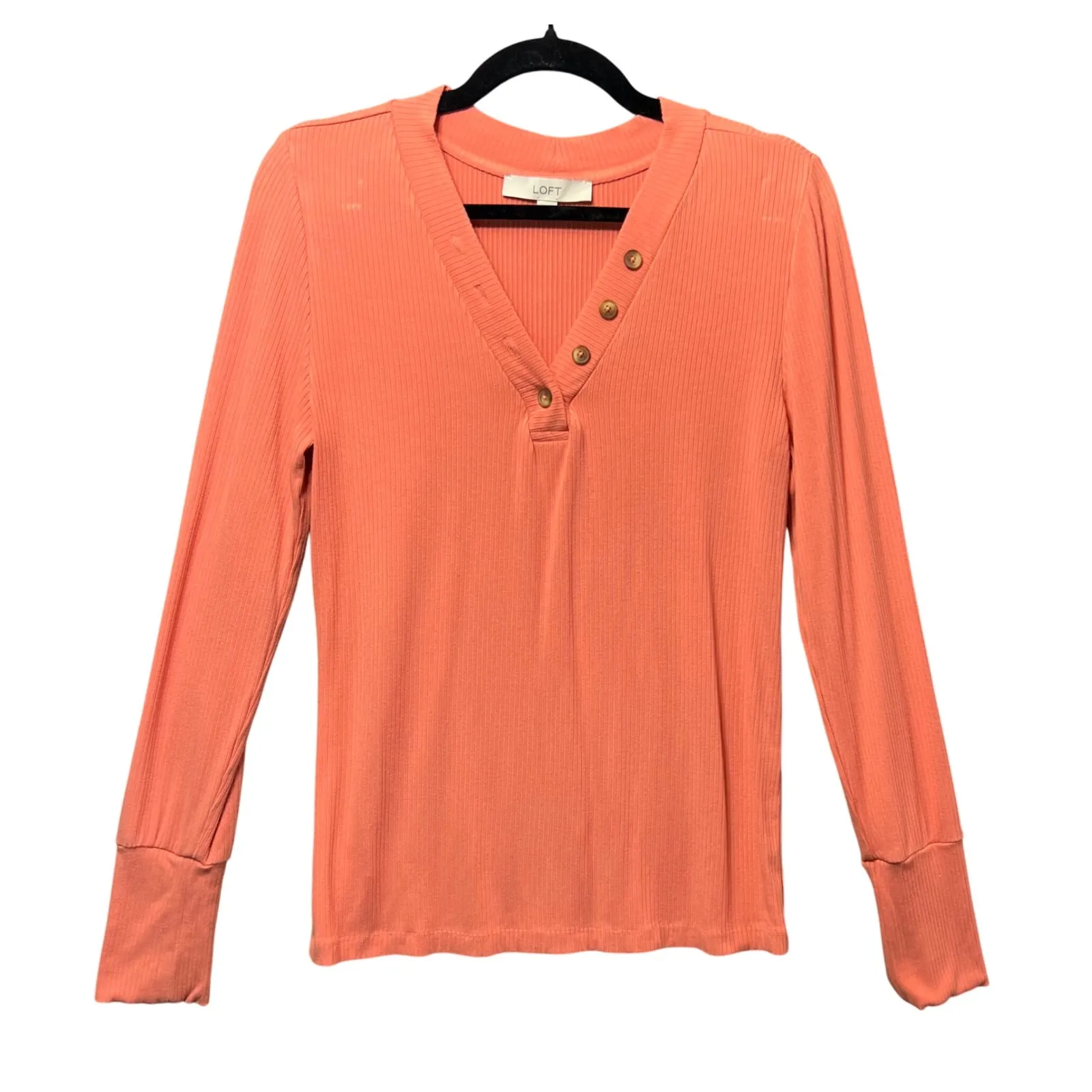 LOFT ribbed long sleeve henley shirt in a vibrant coral hue. Features a classic V neckline with thre... Show more