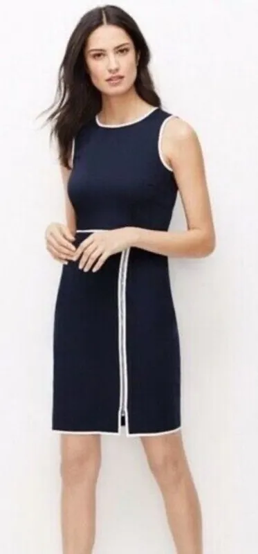LOFT Sheath Dress Size 0 zipper slit in front Navy Blue color with white trim EUC