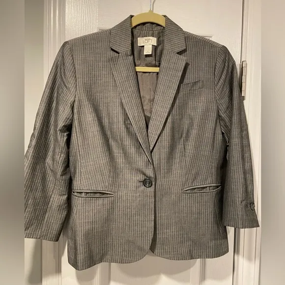 Loft Excellent condition Womens size 2 Gray white pin stripe cropped 3/4 sleeve blazer jacket Lined... Show more