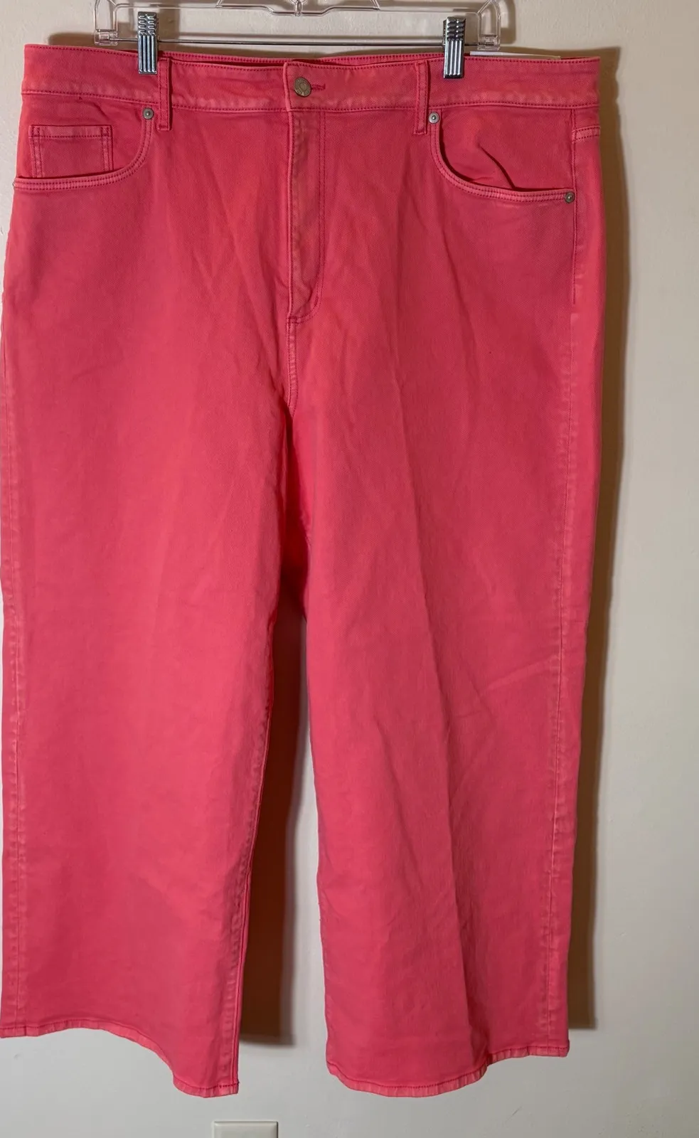 LOFT The Wide Leg High Rise Curvy Fit ankle jeans in a vibrant coral hue. These stylish jeans offer... Show more