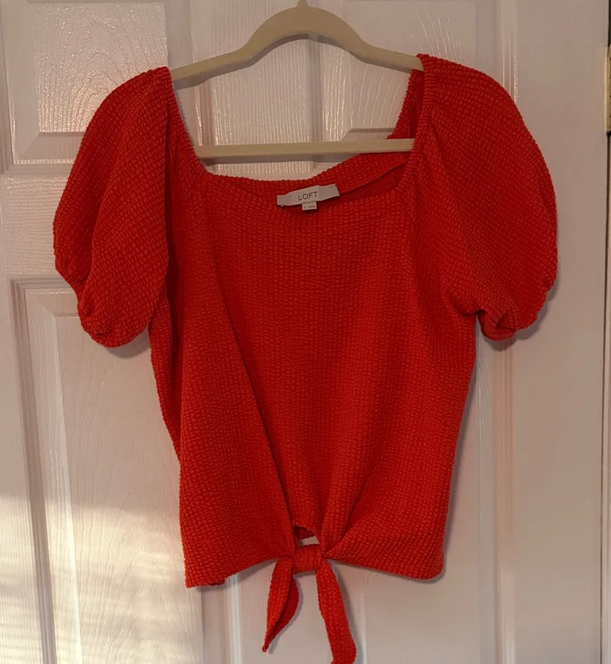 Chic orange blouse with puff sleeves and tie-front. Perfect for versatile styling.