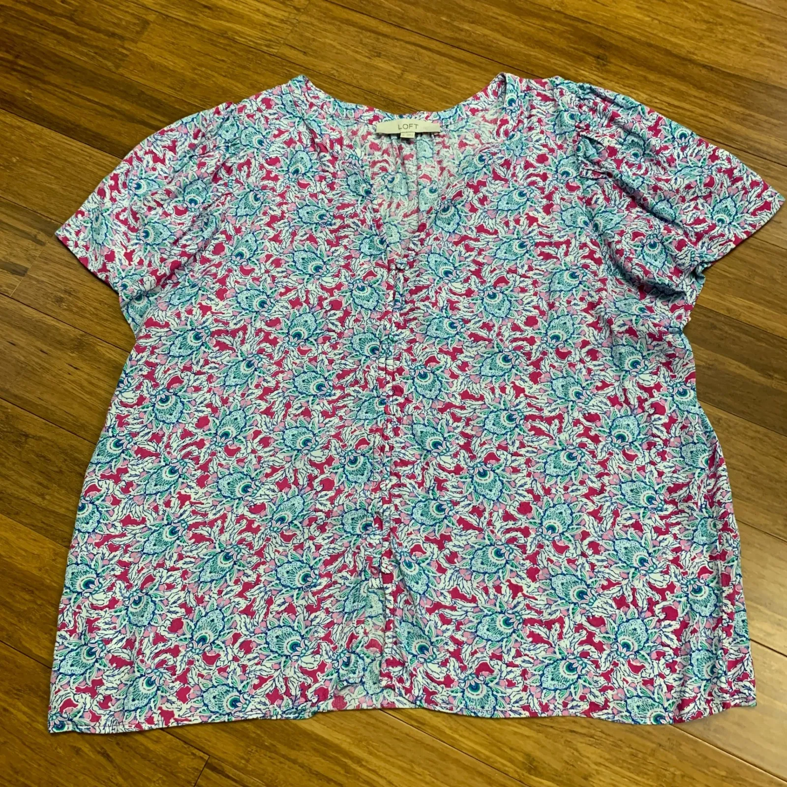 LOFT women's short sleeve blouse showcasing a vibrant floral print. This top features a V-neckline w... Show more