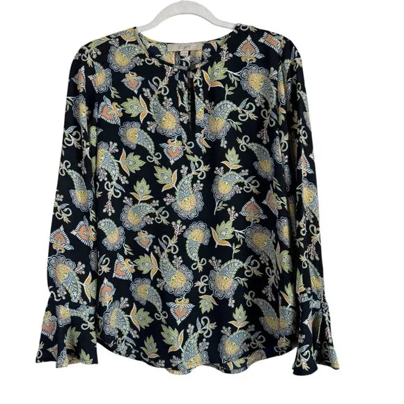 This Loft blouse in size XS features a navy floral paisley design with bell sleeves. It has a round... Show more