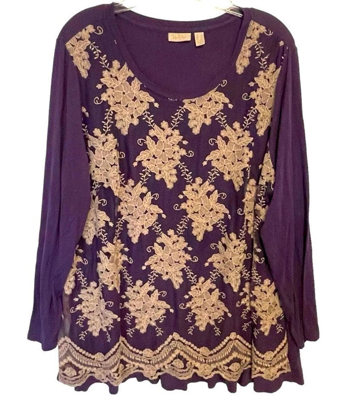 LOGO Lavish Purple & Tan Floral Embroidery Tunic Top Size 1X Step into sophisticated style with this Lavish Lori Goldstein women's tunic top. Crafted from a blend of 90% Rayon and 10% Spandex, this elegant piece offers a comfortable and flattering fit. The eye-catching purple mesh overlay in the front features a stunning bronze embroidered flower, adding a touch of allure to your ensemble. Made from 100% Polyester, the mesh provides a delicate and ethereal look. Designed to follow the lines of your body with added wearing ease, this semi-fitted tunic gracefully flares to an A-line bottom opening, creating a flowy silhouette that's both chic and feminine. The ruffle at the bottom hem adds an extra touch of charm. In good condition with normal signs of wear, this Lavish Lori Goldstein tunic is a versatile addition to any wardrobe. Elevate your style game and make a statement with this exquisite purple long sleeve embroidered tunic top.