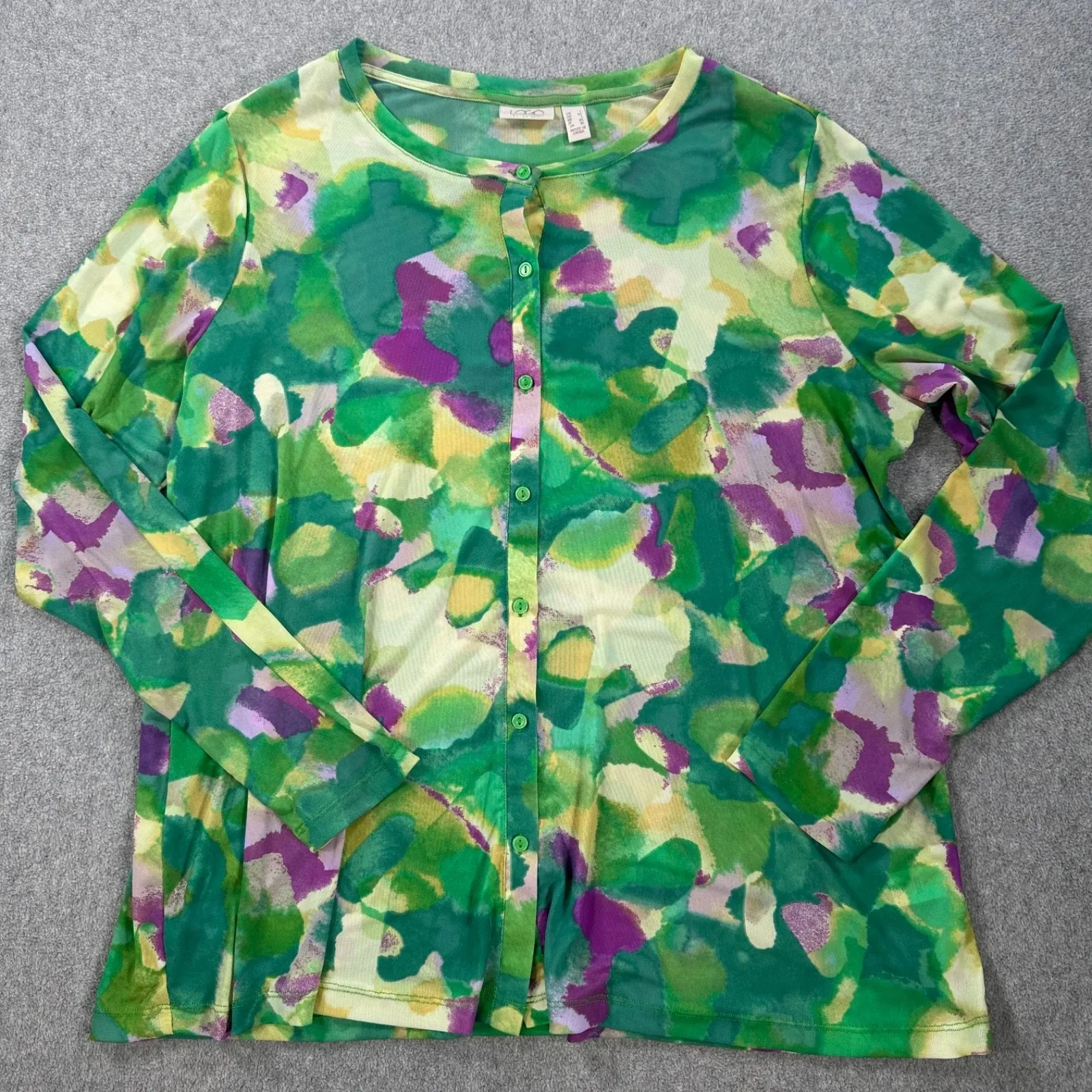Size: Large Condition: Very Good Pre-Owned Condition, No Rips,Stains, or Tears.Please see all photos for most accurate representation of condition Color: Green Closure: Button Pockets: No Material: 92% nylon, 8% Spandex Sleeve Length: Long Sleeve