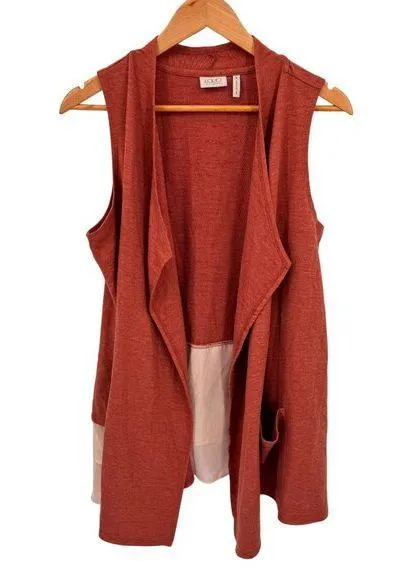 In the vibrant hues of peach and soft cream, this draped vest tells a tale of elegance and casual charm. Its layered hem dances with every step, while the discreet pockets holds small secrets. A versatile piece, it seamlessly transitions from day to night, wrapping you in comfort. • Sleeveless design • Layered hem detail • Drape front style • Hidden pocket • Lightweight fabric Approximate Measurements Laying Flat Across: Chest: 20 inches Length: 30 inches Good preowned condition - no rips, stains, or tears. Seller Notes: -Same/Next Day Shipping -Smoke Free & Pet Friendly Home Size: M