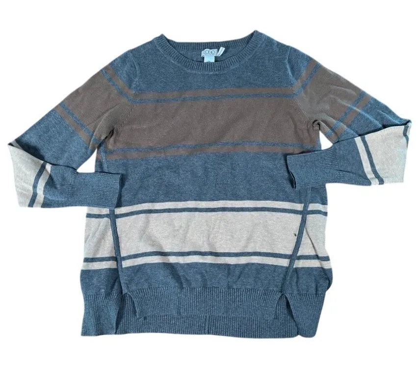 Cozy comfort meets chic style in this LOGO Lori Goldstein striped knit sweater. A harmonious blend of blue, brown, and beige hues creates a visually appealing pattern that's both modern and timeless. The soft knit fabric offers a gentle embrace, making it perfect for cooler days. Noteworthy details include a classic crew neckline, long sleeves, and a relaxed fit that drapes beautifully. The unique side slits add a touch of contemporary flair, enhancing the sweater's overall appeal. This versatile sweater is ideal for a casual weekend brunch, a cozy evening at home, or a stylish office look paired with tailored trousers. Style: Pullover Color: Blue Department: Women Type: Sweater Material: Cotton Blend, Cashmere Blend Neckline: Crew Neck Sleeve Length: Long Sleeve Pattern: Striped Features: Side Slits, Lightweight, Comfortable, Casual Sleeve Type: Raglan Sleeve Fabric Type: Knit Keywords: striped sweater, knit sweater, pullover sweater, casual sweater, womens sweater, blue brown sweater, crew neck sweater, long sleeve sweater, LOGO Lori Goldstein, size M, fall sweater, winter sweater, comfortable sweater, stylish sweater