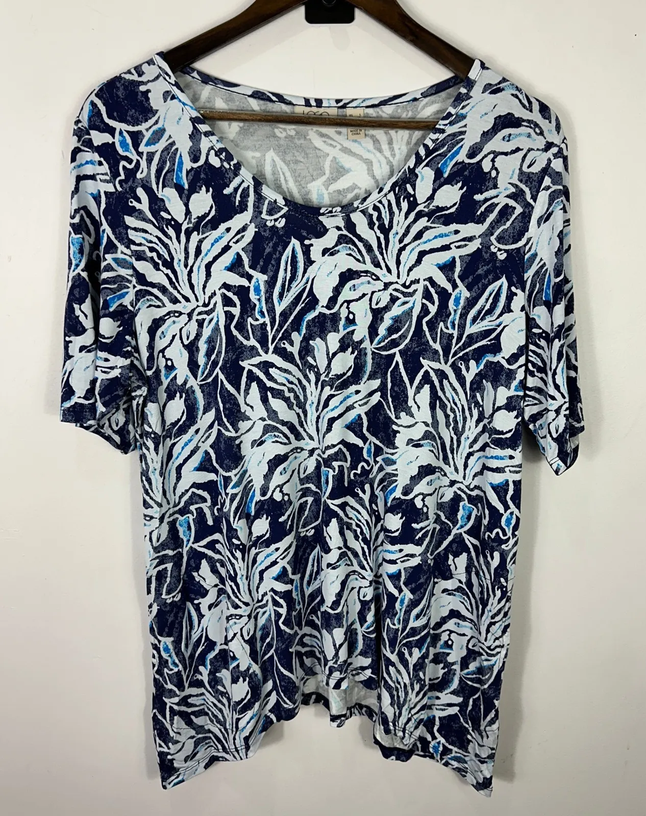 LOGO Lori Goldstein Top L Blue White Botanical Print Resort Artsy Boho Chic Pockets Elevated and versatile LOGO by Lori Goldstein top in size L. Features a blue and white botanical floral print with brushstroke-style texture, short sleeves, scoop neckline, and convenient side pockets. Lightweight stretch rayon blend fabric drapes beautifully and offers breathable comfort. The silhouette and print lean into relaxed resort style, artistic wardrobe essentials, and elevated boho chic outfitting. Perfect paired with denim, linen pants, or layered for all-season wear. True to size with generous stretch. Fabric: 95% Rayon 5% Spandex resort, botanical, artsy, boho chic, elevated basics, breezy, feminine, travel style, mature, capsule wardrobe, quiet elegance, minimalist, soft girl, career chic #BotanicalPrint #BohoChicStyle #ResortWear #ArtsyWardrobe #LOGOByLoriGoldstein