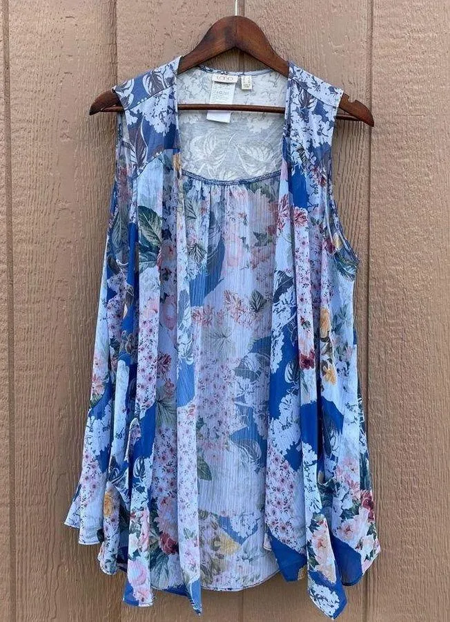 LOGO Lori Goldstein Womens Vest Blue Floral Mixed Media Flowy Spring Size Large - $26 - From Maria