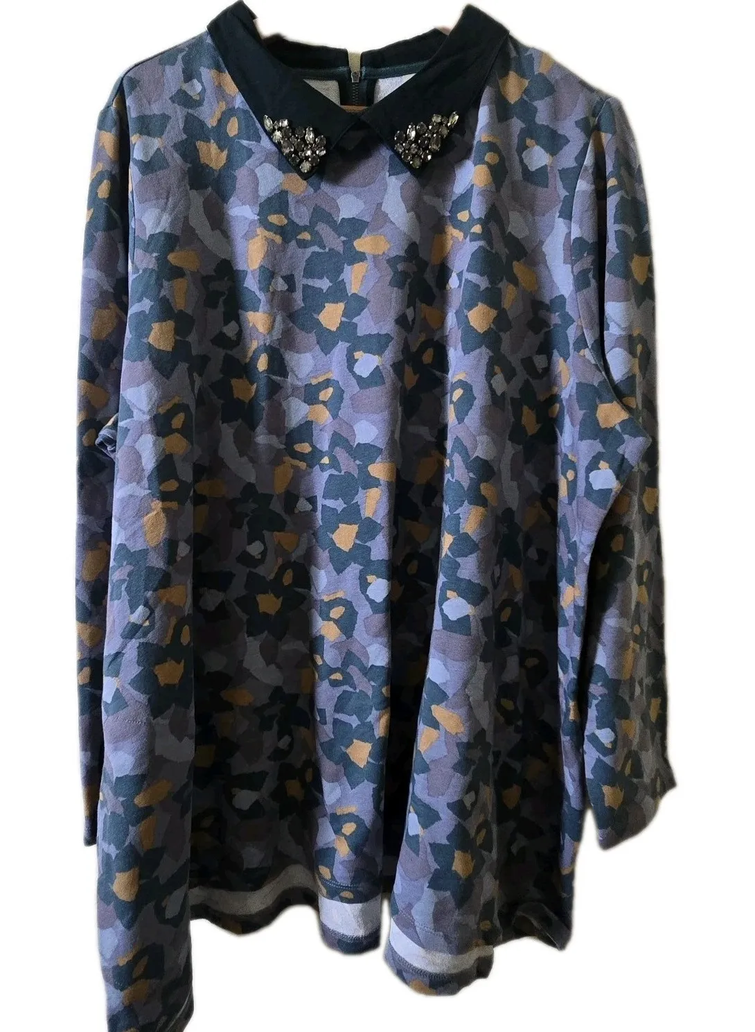 No flaws, gently used, great pre-owned condition! Smoke free, cat friendly home - clothing not stored where she has access. Fast shipping 1-2 business days! Measurements (approx) Length 31" Sleeve from shoulder 26" Chest around 58" Keywords: LOGO Lounge, tunic dress, plus size, 3XL, jewel collar, embellished collar, long sleeve, abstract print, purple dress, gray dress, women's fashion, casual dress, comfortable dress