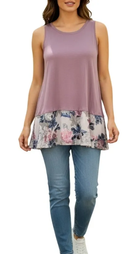 Pre‑owned LOGO by Lori Goldstein mauve pink floral hem tank top in Size Large featuring a mixed media design with a stretchy 95% rayon / 5% spandex body and a flowy 100% polyester floral hem that creates a tunic silhouette with flattering coverage. High neck and sleeveless cut make it ideal for layering or wearing solo with jeans, leggings, or shorts. Flat lay measurements: pit to pit 18”, length 31”. Excellent pre‑owned condition from a smoke‑free home and machine washable for easy care. LOGO tank top, floral hem tunic, mixed media top, mauve pink fashion, high neck blouse, casual everyday style, lightweight cotton blend top. #LOGOTankTop #FloralHemTop #MixedMediaTop #MauvePinkFashion #TunicTop #CasualStyle #WomenFashion #SleevelessTop #HighNeckTop #ComfortableStyle
