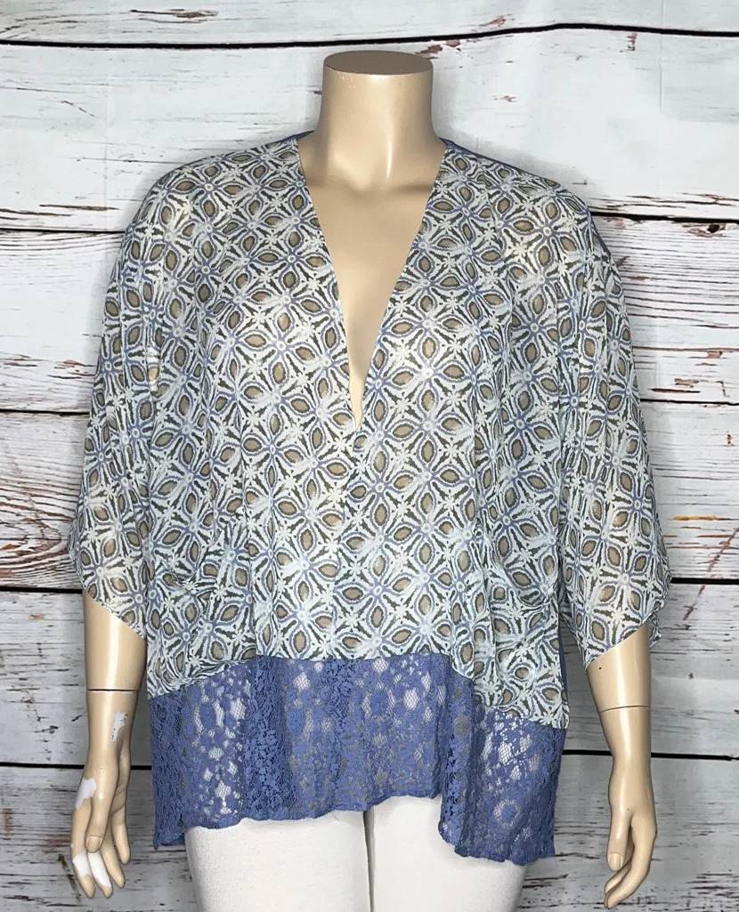 LOGO by Lori Goldstein Size XL Blue Printed Chiffon Kimono Cardigan. Open Front, No Closures. 2 Pockets. Lace Hemline. 3/4 Sleeves. Woven is Polyester - Knit is Rayon/Spandex Blend - Lace is Cotton/Nylon Blend. NWT, Brand New with Tags. Length is 27” to 29” & Bust is 25”. Measurements taken while garment is laying flat.