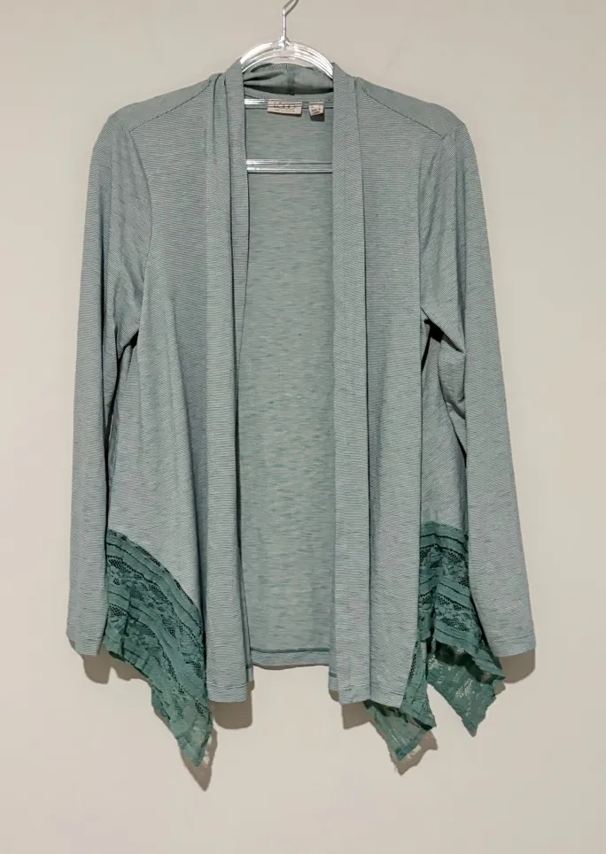 LOGO by Lori Goldstein stripe Lace Trim Tiered Ruffle Open Green Cardigan Women medium. Good condit... Show more