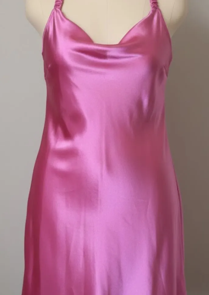 DESCRIPTION 1. Pink satin slip dress with a shiny, silky finish. 2. Ruched straps with cross-back de... Show more