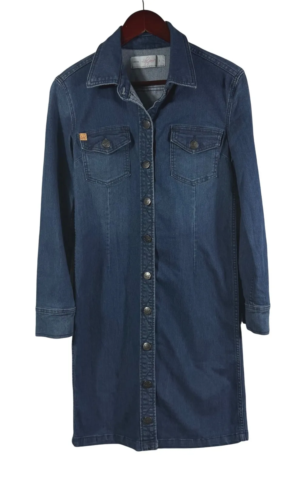 Timeless denim shirt dress by Lola Jeans, known for flattering fits and stretch denim comfort. This piece features: • Button-front closure • Chest flap pockets • Long sleeves with button cuffs • Midi length silhouette • Shaped seams for a flattering fit • Stretch denim for comfort • Can be worn as a dress or layered open as a denim duster A great everyday staple that works year-round — style with boots, sneakers, or layered over leggings. MEASUREMENTS (flat): Pit to pit: 17" Length: 38" Fits approx Women's Small — please compare measurements. FABRIC: 64% Cotton 34% Polyester 2% Spandex CONDITION: Good pre-owned condition. No major flaws noted. Light wear consistent with gentle use. lola jeans dress, denim shirt dress, button front denim, long sleeve dress, midi denim dress, womens small dress, casual denim, western style dress, stretchy denim, layering piece