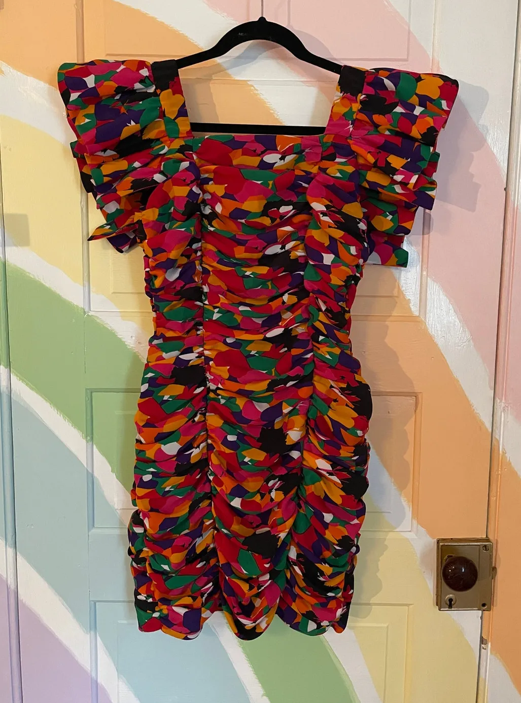 Vibrant vintage Lola Lucena ruched mini dress in a striking multicolor abstract print. Features bold... Show more