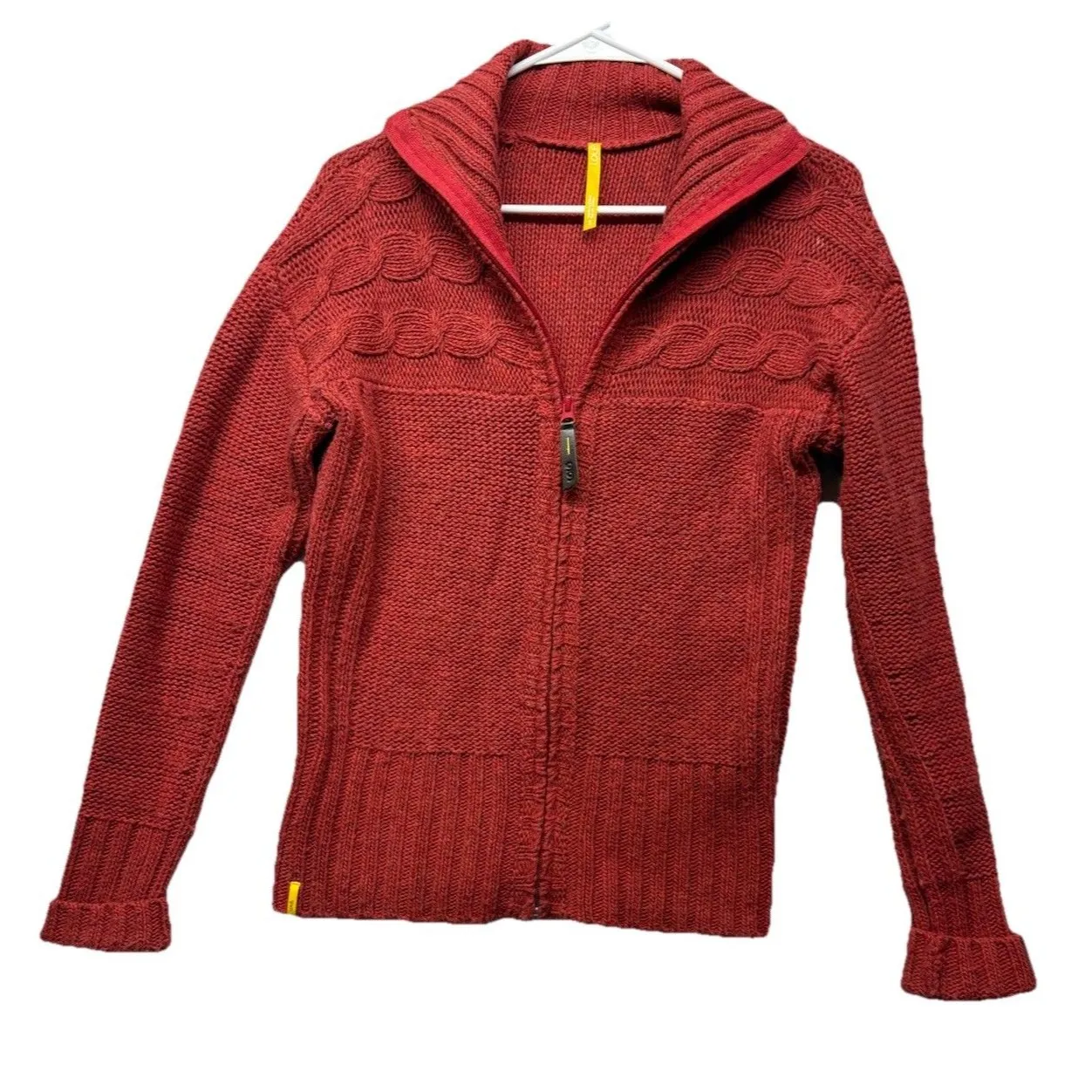 The LOLE Women's Cable Knit Sweater in size small is a stylish and cozy choice for the winter, fall, and spring seasons. This red sweater features a high neck and long sleeves, with a full zip for convenient wear. Made from a wool blend, wool, cotton blend, and acrylic fabric, this sweater offers a comfortable and warm feel. The cable-knit pattern adds a touch of texture, making it a versatile piece for any wardrobe. Perfect for layering or wearing on its own, this sweater is a chic and practical option for chilly weather.