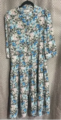. 46" length 3/4 sleeve Loose fit Size Small 100% polyester Color different shades of blue, white, green and even some purple Beautiful floral Bohemian Maxi floral dress Features: • 6 small blue buttons in front • 3/4" sleeves • Floral print • Maxi dress • 3 tiered ruffle