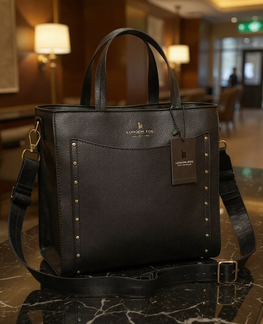 NWT London Fog Sophia Studded Tote Bag in Black. MSRP 118. This structured tote from the London Fog Collection is crafted in durable faux leather PVC with gold tone hardware and stud detailing. Classic silhouette with modern edge. Perfect work bag office tote daily commuter carry or laptop and travel bag. Original tag attached. Zipper top closure. Dual carry handles plus detachable adjustable shoulder crossbody strap. Two outer slip pockets one large front and one small reverse. Interior features logo jacquard lining three pockets total including one zip pocket and two slip pockets for organization. Protective button feet on the base. Dimensions 13.5 inches height without handles x 15 inches width x 4.25 inches depth. Handle drop approx 5.75 inches. Strap drop approx 26.5 inches adjustable. New with tags smoke free home cross posted fast shipping. Perfect gift quality.