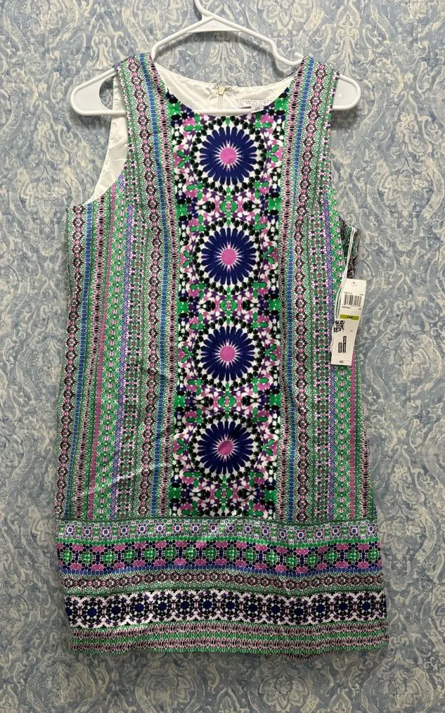 This London Style Petite 14 shift dress is perfect for your preppy coastal style. The floral pattern in pink, green, purple, and white is eye-catching and fun. The sleeveless design and round neckline make it perfect for warm weather, while the zip closure adds a touch of convenience. Made from a comfortable cotton blend material, this short dress is suitable for casual occasions in spring and summer. It's brand new with tags, so you can be assured of its quality. Get ready to rock your preppy look with this cute London Style dress!