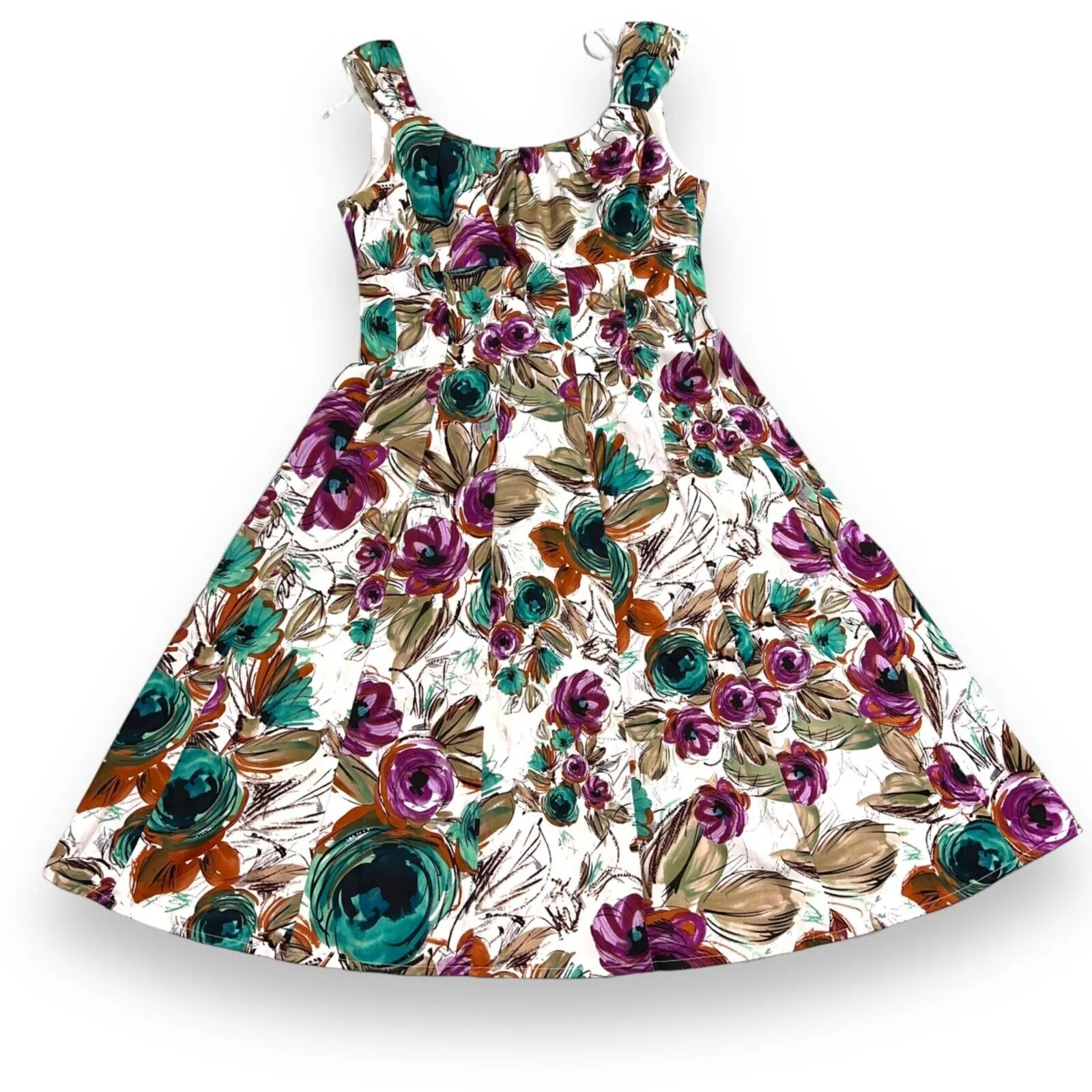 Party Dress Floral Sleeveless Fit & Flare Purple Green London Style Condition: EUC Like New Size: 6 Description: Fit & flare party dress Purple teal and brown floral print Sleeveless wide straps Pleated scoop neck bodice High waist just under bust with fitted torso and flared flowing skirt Lined bodice Hook and zip back closure Made in Sri Lanka Cotton Spandex Polyester Dry Clean Party special occasion wedding cocktails summer spring formal Easter holiday church Approx measurements: 15.5" pit to pit 14" waist 38.5" length If purchased by noon central time I try to ship same day Weight: 12O SKU: Z102 Purple Green Floral Party Dress Sleeveless Fit & Flare London Style