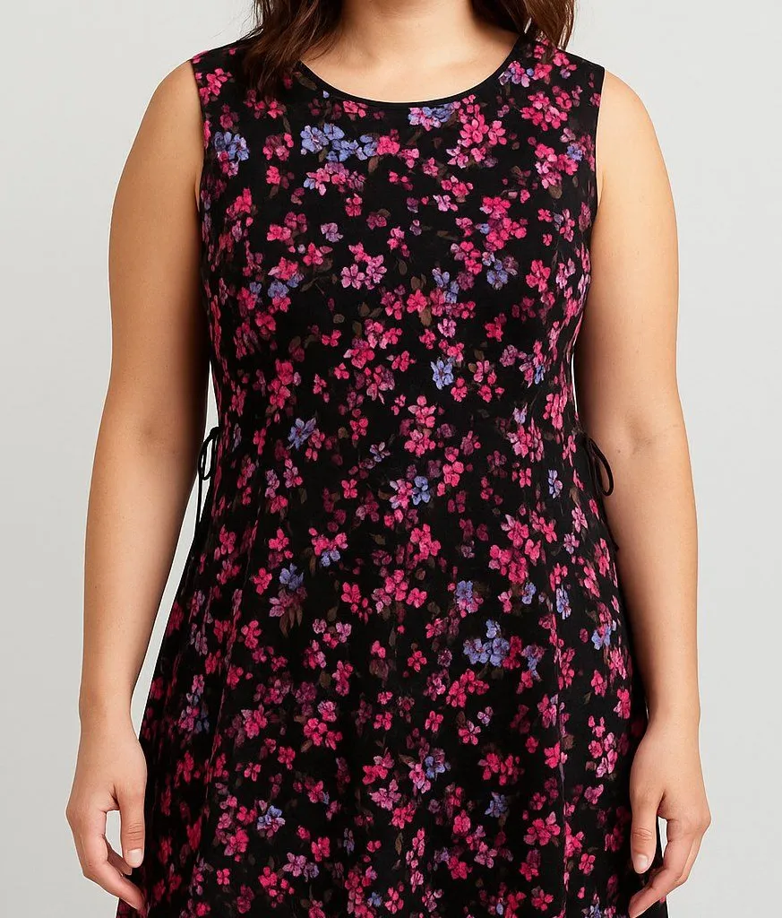 Beautiful London Times A-line dress featuring a vibrant floral print in pink, purple, and blue on a black background. Sleeveless design with subtle side ties and a flattering silhouette—perfect for office wear, events, or everyday chic style. Brand: London Times Size: US 14 (UK 18 / EU 44) Style: Sleeveless floral A-line dress Color: Black with pink/purple floral print