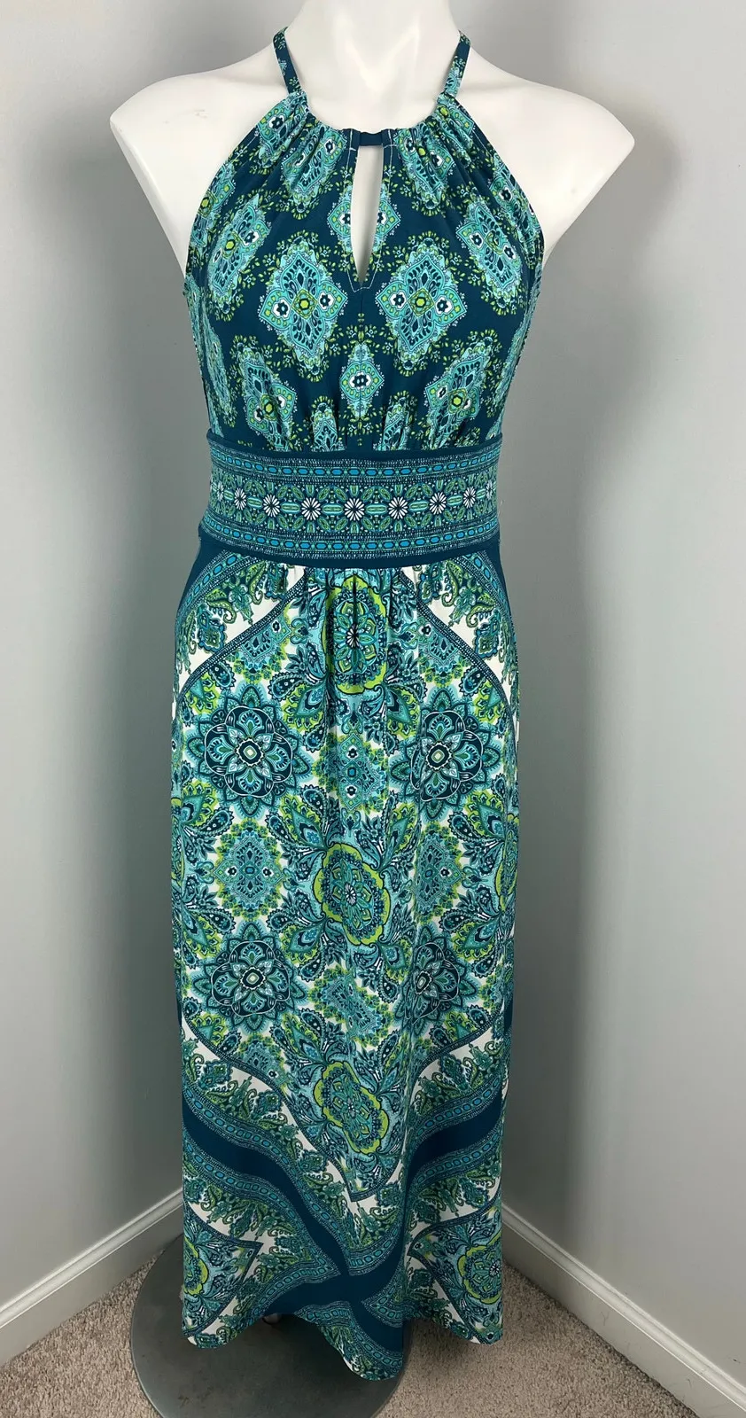 London Times dress, size 4 Soft stretchy material, fitted waist, high neck and keyhole neckline Polyester spandex blend Total length: 54” Chest armpit to armpit: 17” Waist lying flat: 14.5” In excellent preowned condition
