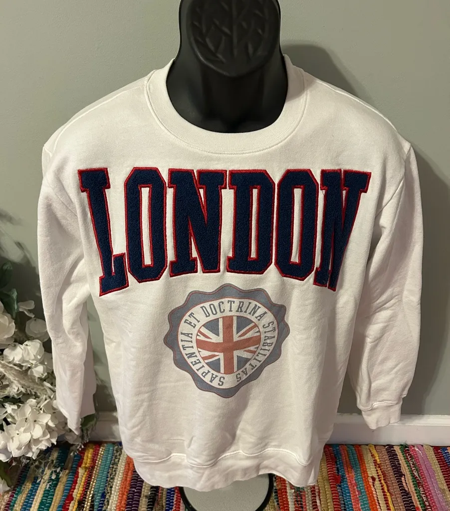 London Vasristy Letterman Crewneck Sweatshirt Chenille Letters spellout on front. Wear this on your next trip to United Kingdom. London is the historic capital and largest city of the UK, a global hub for finance, culture, and politics, known for its mix of ancient landmarks (like the Tower of London) and modern vibrancy, diverse population speaking over 300 languages, world-class museums (British Museum), vibrant theatre (West End), iconic red buses, and royal heritage, all centered on the River Thames for nearly 2,000 years since its Roman founding as Londinium. Size: Medium Chest: 20.5 Length: 26" Color: White Condition: Like new UK Olympics Eye Ferris Wheel River Thames Big Ben Westminster Abbey Parliament, Pete Tong Radio 1 BBC Fabric ministry of sound, mind the gap