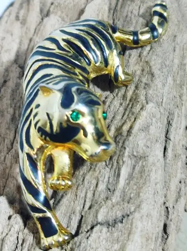 A striking vintage tiger brooch with black enamel accents, crafted in gold-tone metal, and adorned with emerald green eyes. Evoking timeless elegance. • Secure pinback closure • Approx. 3 inches in length • Detailed enamel and eye design • Lightweight and durable construction top to bottom = 3 inches ~Buyer Please Note ~ All items are professionally cleaned and ozone-sanitized before shipping, which may leave a light temporary scent. Most listings are pre-owned — Please feel free to request any additional details before purchasing. I respond quickly to all inquiries. Reasonable offers are always welcome.