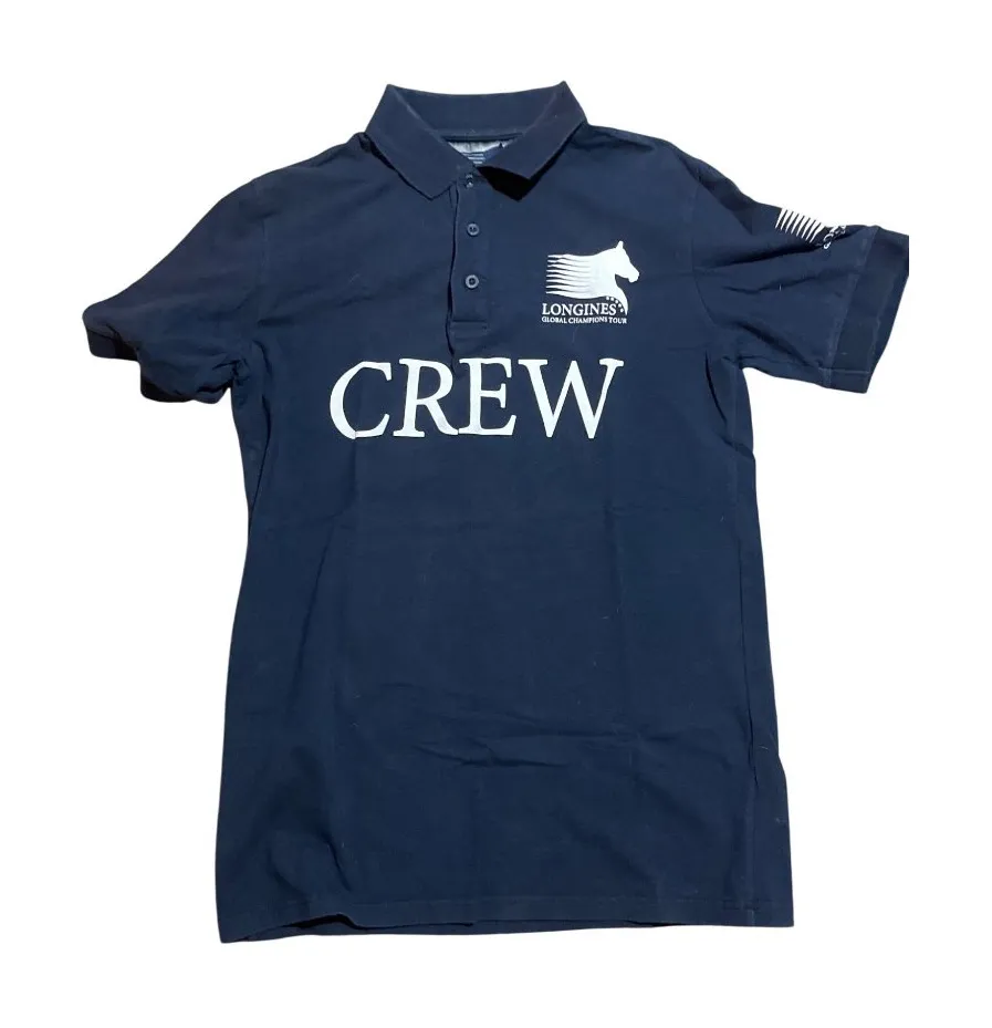 The wind brushed against my skin, and the navy polo whispered tales of equestrian elegance. Stitched with pride, this shirt is for those who gallop through life’s adventures. A nod to the champions, it carries the spirit of Italy’s craftsmanship and a legacy of grace. • Features a classic polo collar with a button closure • "Crew" text and Longines logo on front and back • Comfortable 100% cotton fabric • Made in Italy for premium quality • Short-sleeve design with cuffed edges No visible flaws noted. Top to bottom = 28 inches, pit to pit = 20 inches. 12c/9 9x12