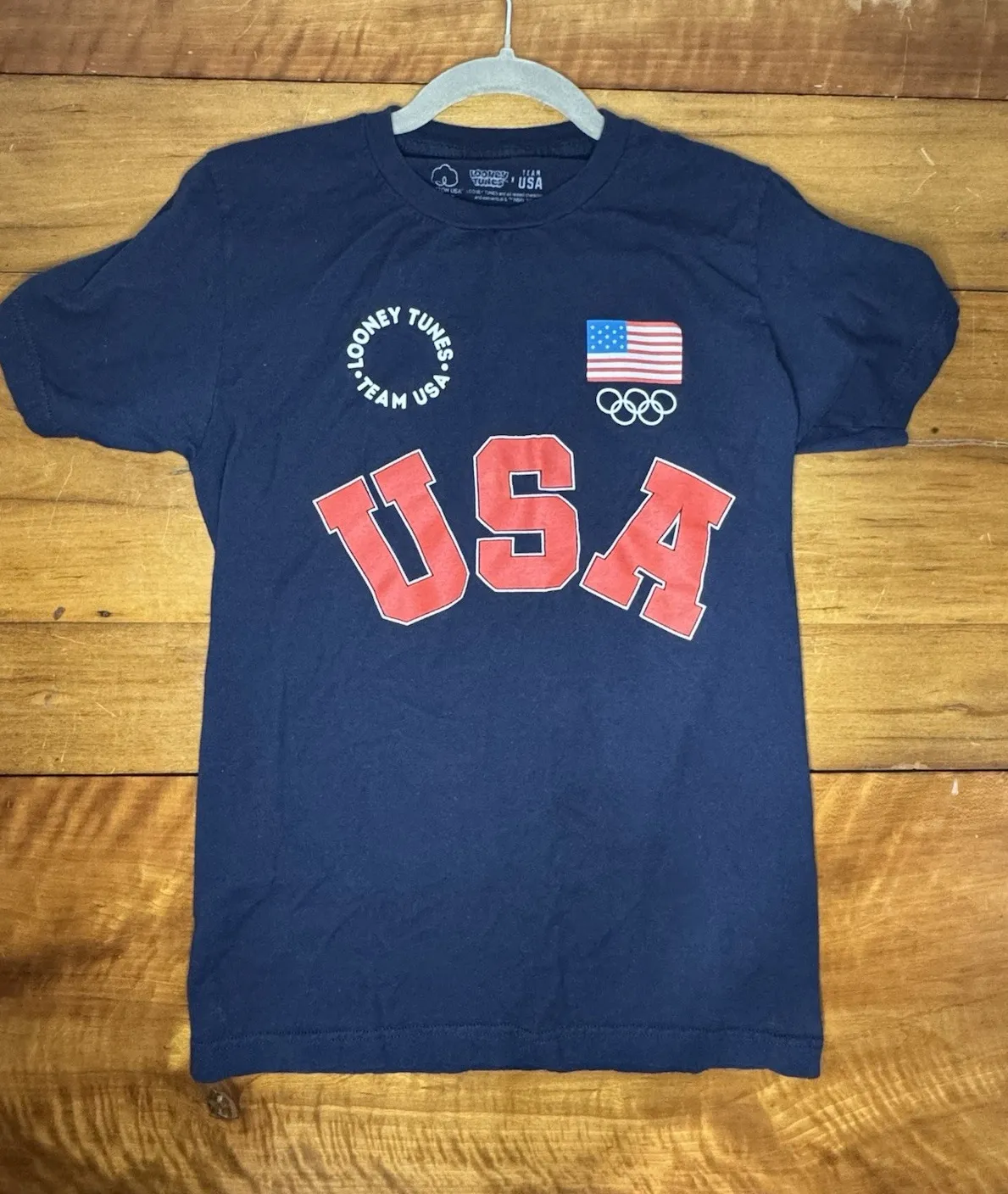 This is an official Looney Tunes Team USA Olympic t-shirt in navy blue, size Small (34/36). Features: ∙ Front: Bold red "USA" lettering with American flag and Olympic rings, "Looney Tunes Team USA" circular text at top ∙ Back: Looney Tunes characters (Bugs Bunny, Taz, Tweety, Daffy Duck, and Wile E. Coyote) with "Team USA" text and Olympic branding ∙ 100% cotton ∙ Made in Mexico ∙ Machine wash cold with like colors, tumble dry low Condition: [You'll need to assess - appears gently used from photos] Measurements: Size: Small