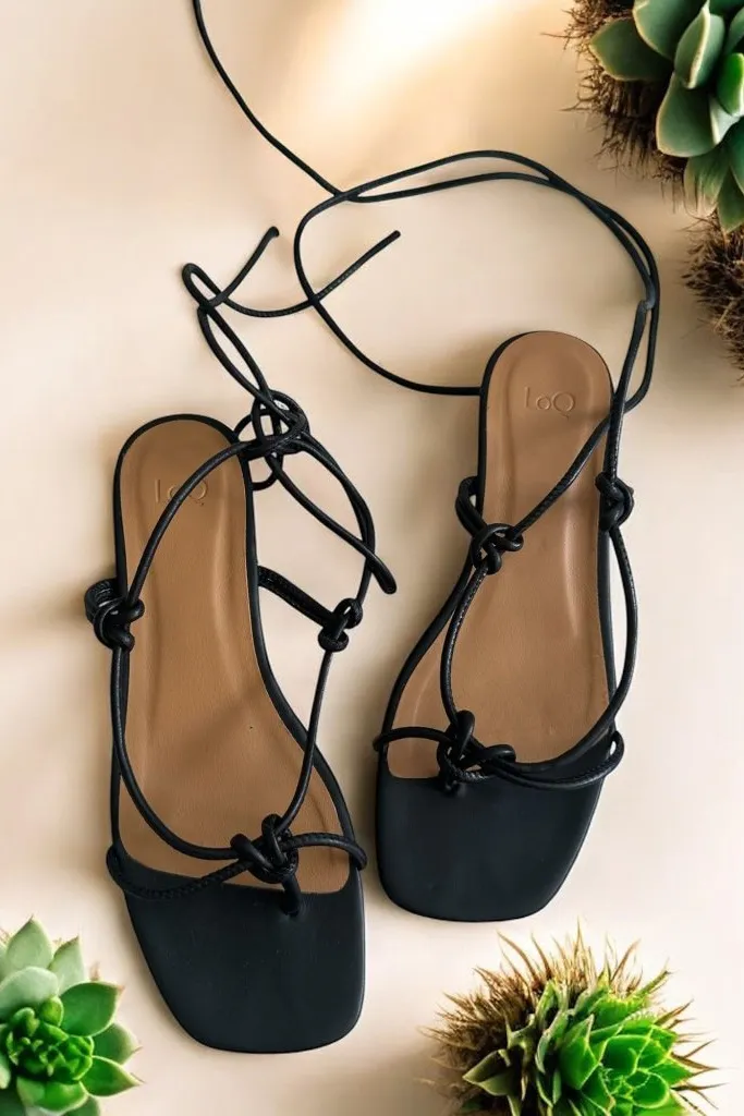 Elegant black leather kitten heel sandals with a sophisticated lace-up design, perfect for elevating... Show more