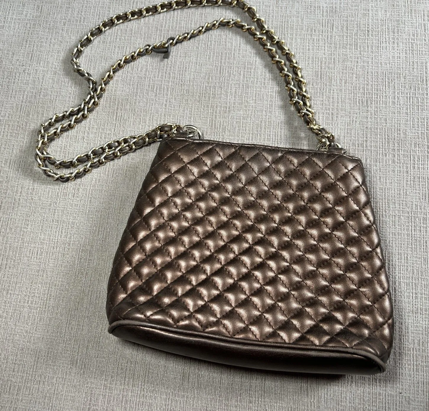 Lord & Taylor Quilted Chain Shoulder Bag Bronze Metallic Purse Crossbody Womens Condition: Gently worn, no visible flaws, very light signs of previous use Quilted faux leather exterior in metallic bronze brown with diamond pattern stitching Gold and silver tone chain shoulder strap with faux leather threading Magnetic snap closure Inner zip pocket and slip pocket for organization Tag reads: Exclusively For You Saks Fifth Avenue Interior tag: Made in China Approximate size is about 8.5" wide x 7" tall x 2.5" deep (see photos for measurement references) Perfect for evening out, special occasions, or everyday glam On one of the straps in the interwoven metal and leather there is a separation in the leather as shown. bin 97