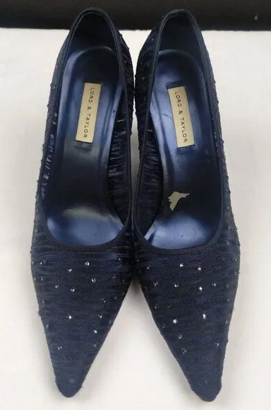 Offers a 3.75 inch heel with a covered pointed toe style and rhinestone design all around. Great condition: last 3 pictures show minors signs of peeling in the insole and a couple rhinestones missing. This item has been cleaned, sanitized and deodorized. Features: • Shoes/Heels Size: Womens 8 Condition: Pre-Owned Good