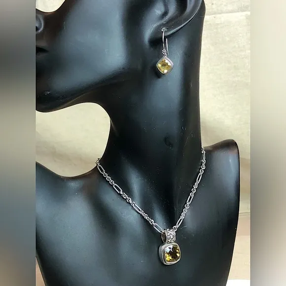 with Coordinating Pendant RARE LORI BONN Sterling Silver Earrings and Necklace Set French Wire Backings Cushion Cut Gemstones Set on The Bias Stunning Golden Citrine Gemstones with Rope Design Around The Bezel Necklace Has Mixed Link Sterling Silver Chain with Coordinating Square Cut Citrine Pendant SIGNED: Lori Bonn, 925 CONDITION: Vintage, Excellent Stored Condition CARE: Avoid Use of Silver Polishes and Cleaners as They Can Yellow Vintage Silver and Damage Porous Gemstones. Wipe With Jewelry Polishing Cloth After Use and Store In Airtight Jewelry Bag to Prevent Oxidation Colors May Vary Based On Shadows, Lighting, Monitor, Display Settings Ask Questions and/or Request Additional Photos, Measurements as Needed Photos of Measurements are Available in The Slides No Returns, No Exchanges, No Trades, No Cancellations, No Accidental Bids ALL PHOTOS AND DESCRIPTIONS ARE COPYRIGHT PROTECTED. ALL LEGAL RIGHTS RESERVED AND PROTECTED BY DMCA AND WILL BE LEGALLY ENFORCED.