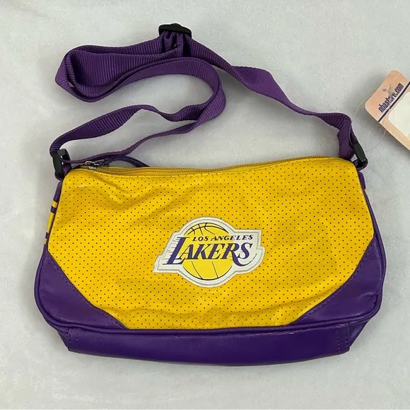 Brand new with tags & defects. The Faux leather on the bottom of bag starting to crack & the backside of the bag has some darker markings indented in the back.(All pictured) The bag is still New and in good shape. ITEM IS STILL BRAND NEW! Small/ Medium Bag size -about 11” length x 5.5” height x 2” width. White yellow color & Purple. With embroidered stitched on patch logo. NBA Genuine Merchandise Please see all pictures for details Open to offers
