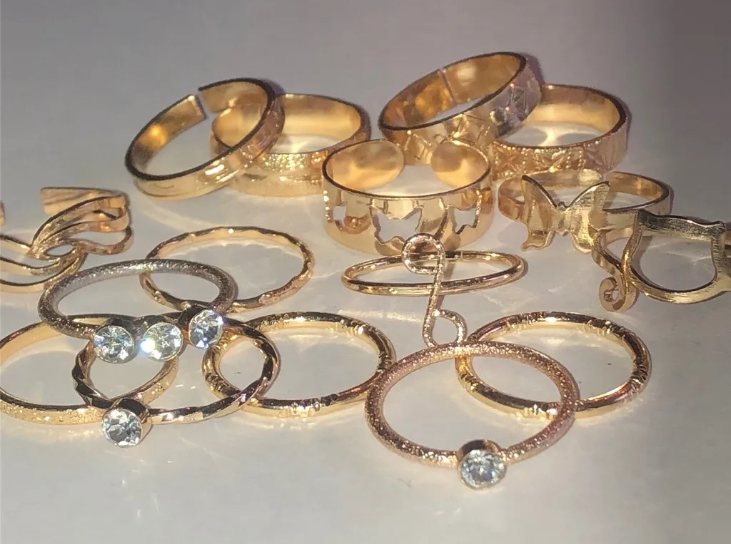 Enhance your style with this elegant gold-tone ring set. Perfect for any occasion, these rings add a touch of sophistication to your look. Good condition Various sizes Lot of 15 F9 Boho Vintage Street Style Minimalist Statement Piece Essential Trendy Fashion Forward Must-Have On-Trend Cute Casual Edgy Classic Rare Find retro mid century modern estate jewelry costume jewelry