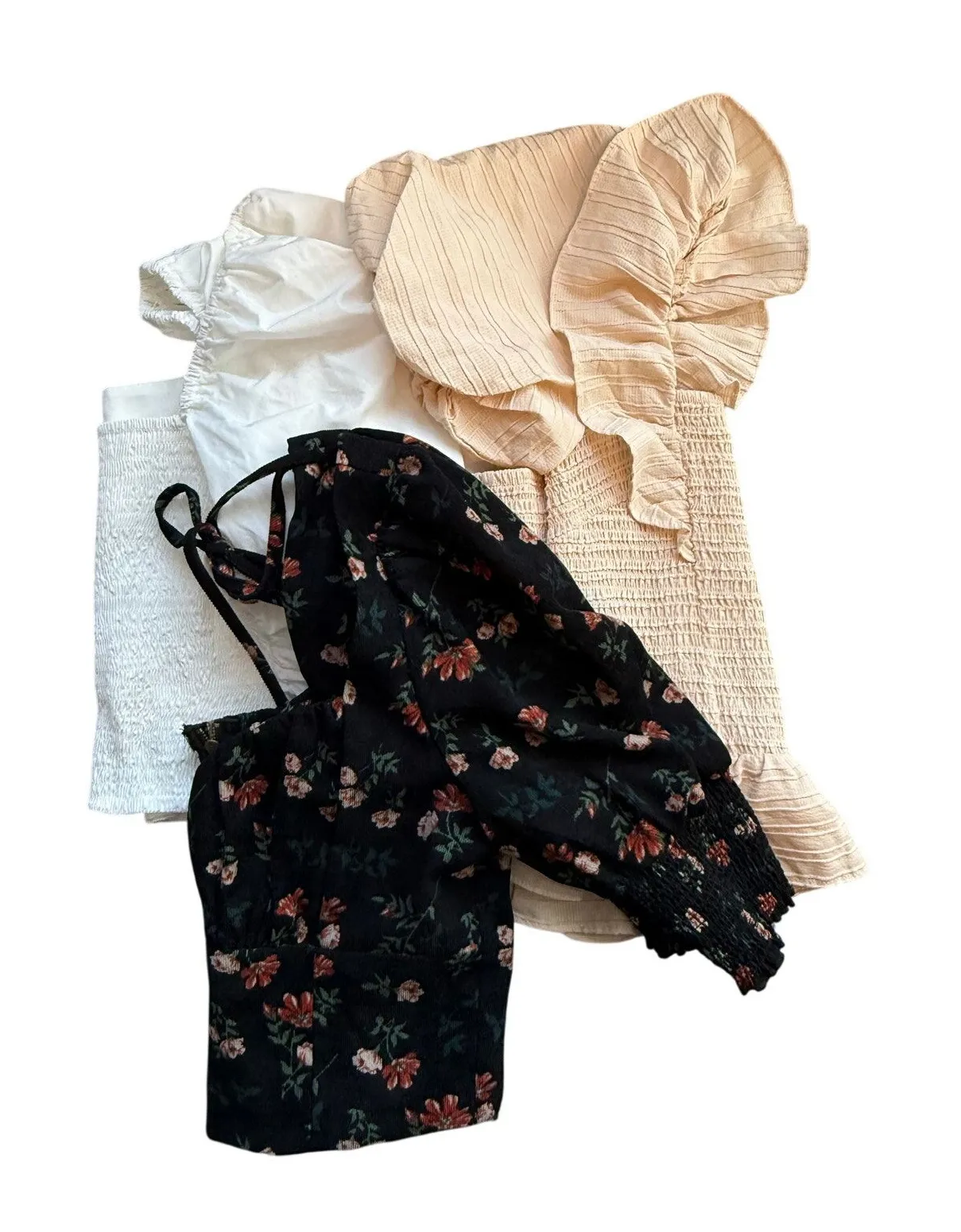 Romantic lot of three cottagecore-inspired tops featuring soft textures, smocking, puff sleeves, and... Show more