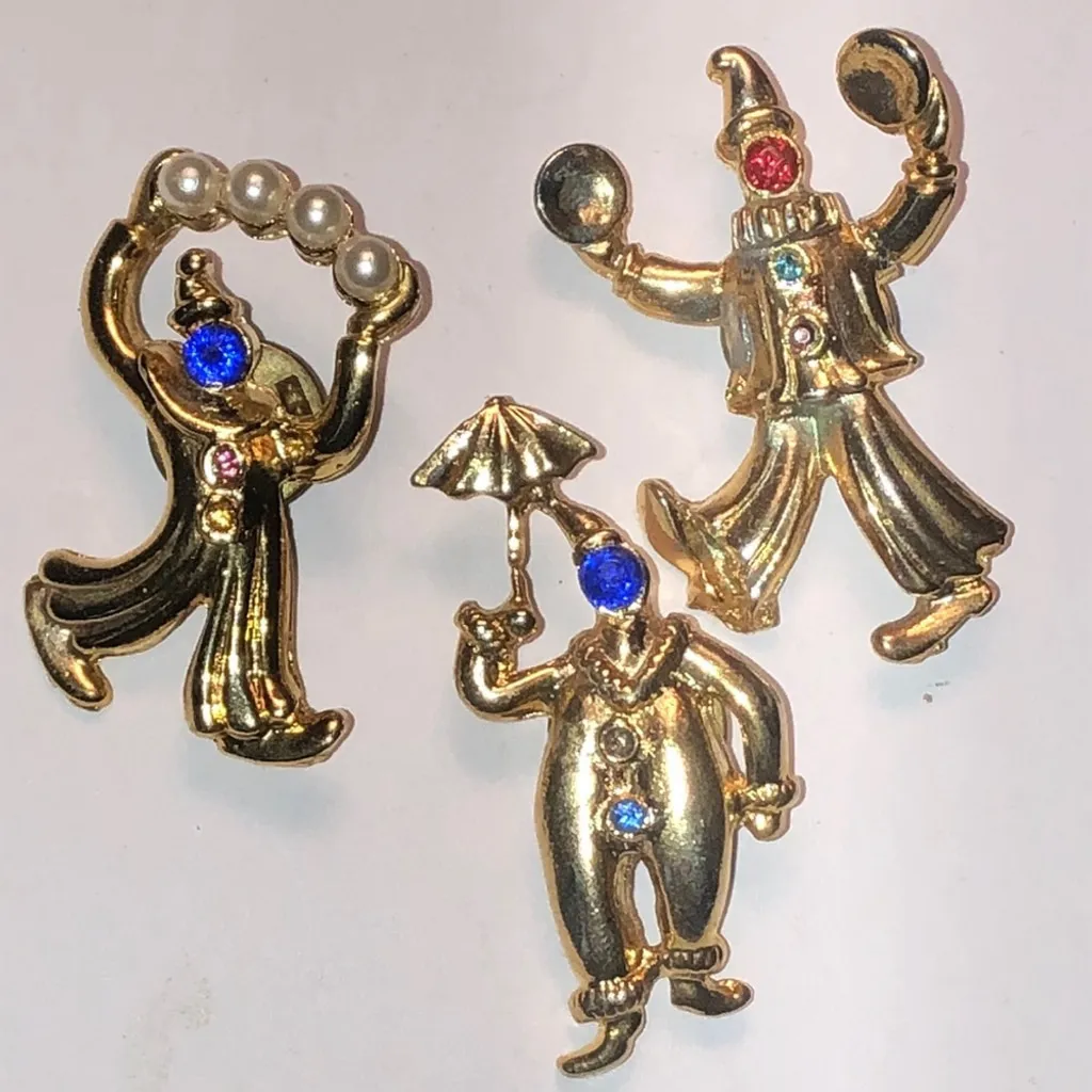 Lot of 3 Vintage Gold Tone Colorful CZ Rhinestones Clown Brooch Shoulder Pins - $27 - From Vault