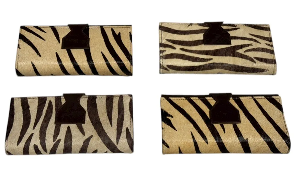 Thank you for your interest in my item Lot of 4 wallet for one price Model No.: AE319 Product Features: 1. This clutch mainly opens with snap closure 2. Inside this clutch, there are three compartments along with two zipper pockets and multiple card holders and one transparent photo slot. 3. Inside, cotton lining material is used. 4. On backside one zipper pocket is also given. 5. On front side beautiful animal print fur given which adds a caharcter to the clutch