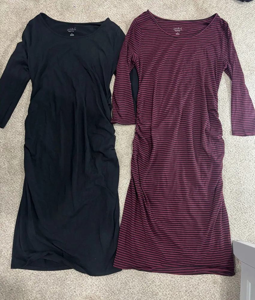 . Both in good preowned condition other than being wrinkled from being in storage. No rips, holes, or stains. Maternity dress Long sleeve maternity dress Black maternity dress Stripes Long sleeve Pregnancy Maternity