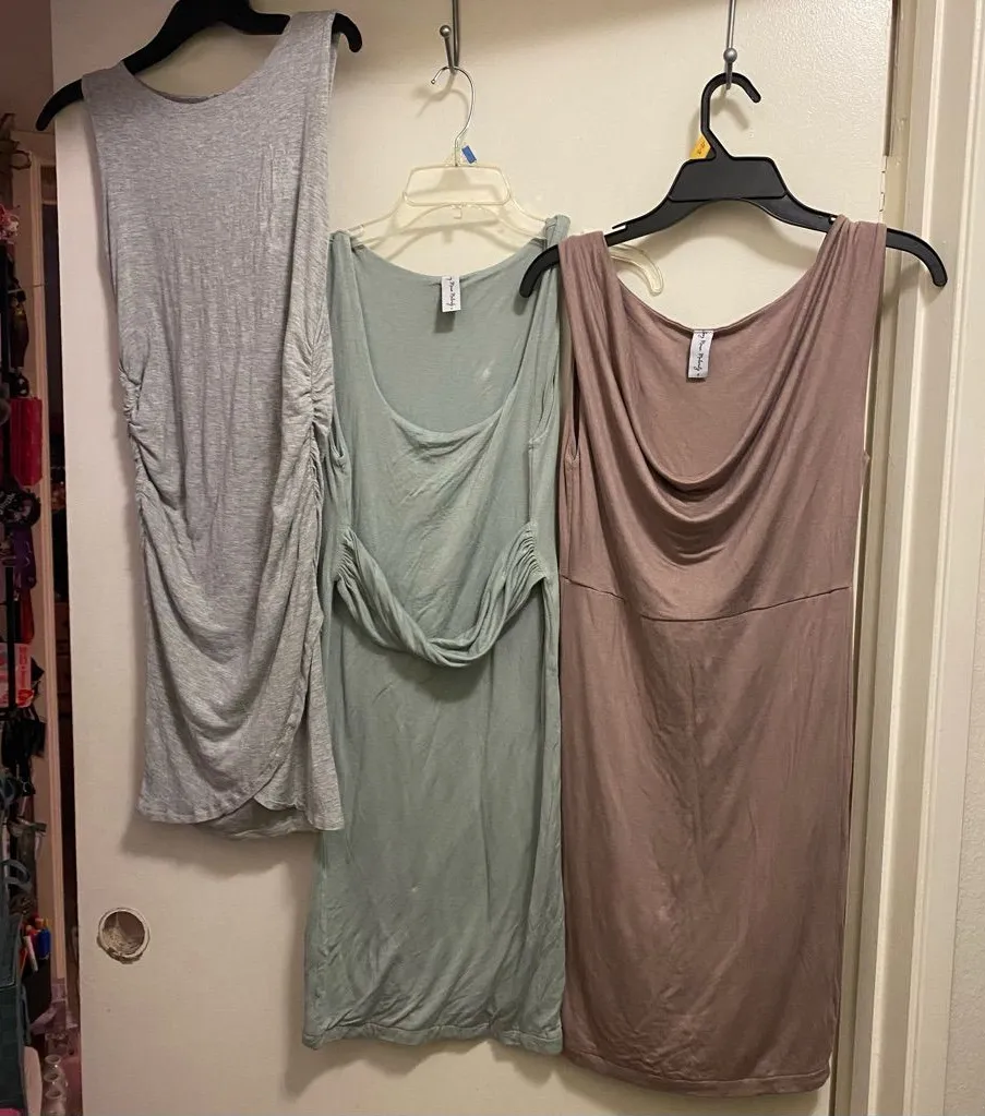 A collection of three sleeveless dresses in gray, green, and brown. Perfect for casual outings. All are in great condition with no stains or damages Pit to pit is 17” across when flat and stretches to 19” for bust measurement of 34” to 38” Waist is 16” across and stretches to 19” for waist of 32” to 38” Length 33” to 35” Super soft and lined cotton / spandex blend fabric
