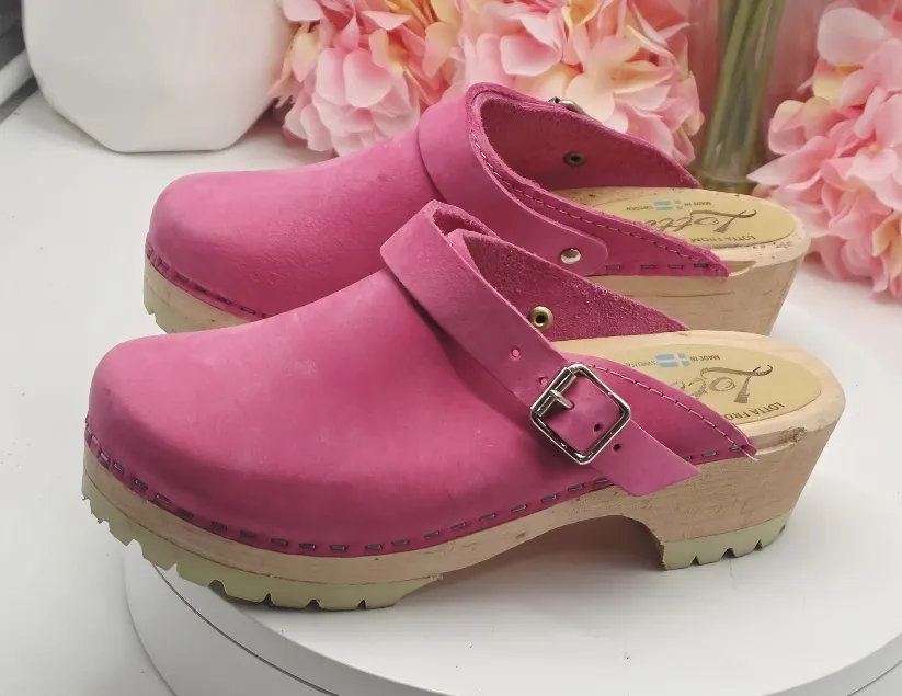 Swedish size 38 Origin: Imported Sole material: Wood Outer material: Leather Closure type: Pull-On About this item: Classic Scandinavian Styling Genuine Swedish Clogs Handcrafted in Sweden Premium Italian Oiled Nubuck Leather Swedish Adler wood base 2-inch heel offet by a 0.75-inch platform Description: Since their explosion on to the global stage in the 70s classic clogs have provided generation after generation with that Scandinavian look. No other style of footwear combines iconic styling, practicality and comfort in such a simple package. The extra chunky ‘Tractor’ sole on these clogs was inspired by the ‘Tractor Sole’ trend in the 70s where young Swedes would look to customise the look of their clogs by cutting out sections of old tractor tyres and nailing them on to their clog soles for that chunky look. These Lotta From Stockholm clogs are crafted with love and care in Sweden using Italian vegetable tanned oiled nubuck leather for the uppers and seasoned Swedish Alder from sustainable managed forests for the base. A 2-inch heel offset by a 0.75-inch platform provides enough height to allow the properly shaped footbed to be formed which includes both a pronounced arch support and a big toe indent for easier walking.