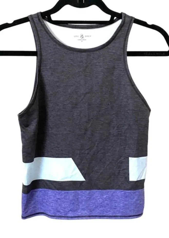 Dark gray, light blue and purple colorblock tank. Soft & stretchy polyester, spandex workout style t... Show more