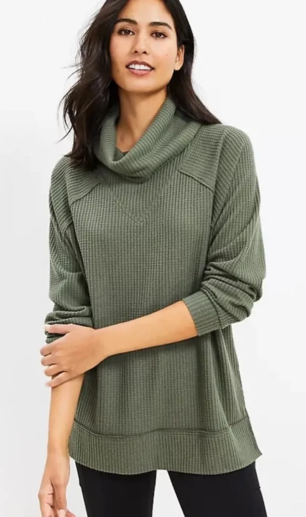 Lou & Grey Olives Green Waffle Cowl Neck Tunic Top Hi Low Long Sleeve Sweater - $28 - From Iris