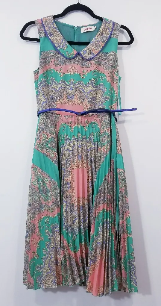 size Small Size: Please refer to measurements for accurate fit. sleeveless, collared, pleated fit & flare dress This elegant midi dress features a vibrant paisley pattern in teal and coral. Perfect for any occasion, its sleeveless design and flowy silhouette offer both comfort and style.