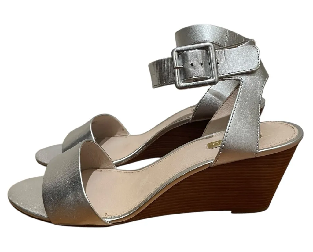 Louise et Cie “Lo Punya” metallic sterling wedge sandals featuring a sleek open toe, wide front strap, and ankle buckle closure. Leather upper and lining with a 3-inch stacked wedge heel. Elegant and comfortable—perfect for dressing up or casual summer looks. Details: • Style: Lo Punya • Color: Metallic Sterling • Size: Women 11M • Material: Leather upper and lining, man-made sole • Heel Height: 3” • Condition: Excellent pre-owned condition 5 star seller! Will ship same or next day (except for weekends) Bundle to save!
