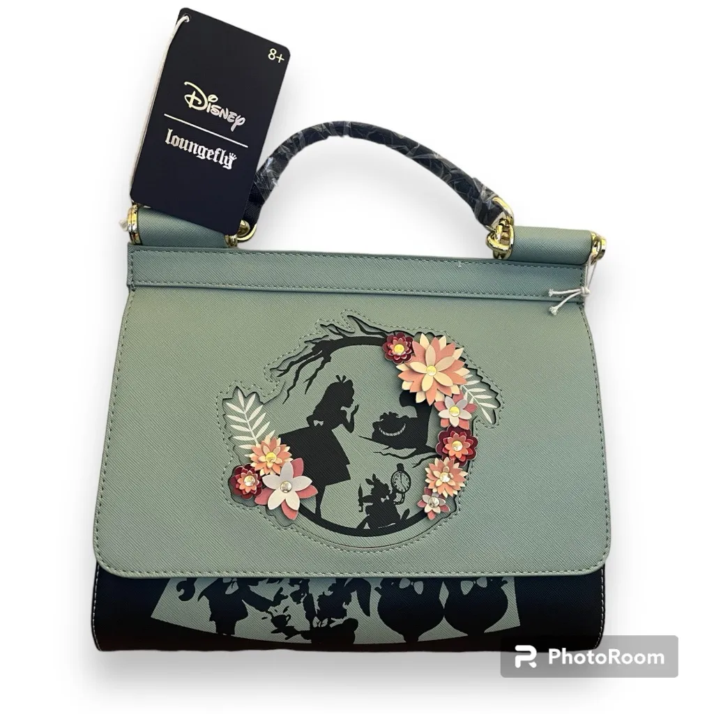 Get ready for a very important date with this Alice in Wonderland-inspired handbag! Featuring a die-cut silhouette portrait of Alice, the White Rabbit, and the Cheshire Cat, the front flap also includes applique flowers. With silhouette portraits of other characters on the body, this bag includes a top handle and a removable crossbody strap, perfect for preparing for your next adventure in Wonderland. Polyurethane; polyester lining Approx. 11" W x 8" H x 4 1/2" D Imported New with tags
