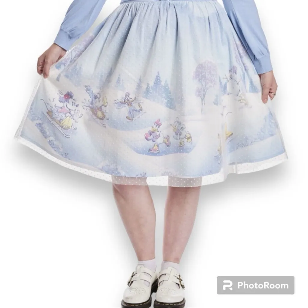 This ice-blue skirt features pastel colors and beautiful designs. Flocked dots of snow, on the tulle overlay, fall upon a fun-filled scene, in which Disney’s Mickey Mouse, Minnie Mouse, Donald Duck, Daisy Duck, Chip, Dale, Goofy, and Pluto play in the snow. The overall effect is a dreamy, flowing look on a classic circle skirt with pleated hem. This Stitch Shoppe Disney Mickey Mouse and Friends Winter Tulle Overlay Skirt is made of super soft stretch material (98% cotton/2% elastane). Hitting just at the knee on most, this skirt features a zipper back, pockets, elastic waist detail at the zipper, and a button closure. Each skirt comes with a matching Chip and Dale Winter Wonderland enamel pin, which is approximately 1.5 inches tall. This pin is only available with this collection. This skirt is officially licensed by Disney. Size XL New
