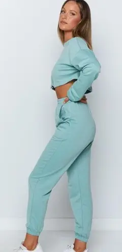 Light used and only worn a couple of times Sea foam/Turquoise/Green Lounge Set Track pants feature an elastic waist and ankles Trackpants have two front pockets Jumper features drawstring hem and wrist with black toggles Jumper has a crew neckline, crop length and long sleeves